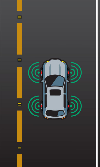 Tire Pressure Monitoring Systems (TPMS) have been mandated in the US since 2008. These systems are located in the wheel wells (red sensors on images) and only use about 40% of their bandwidth. Utilizing separate frequency channels, the RF-eye system can utilize this infrastructure without jeopardizing tire pressure safety. Additional sensors can be easily added to the front and read of the vehicle to detect objects in front and behind the vehicle.